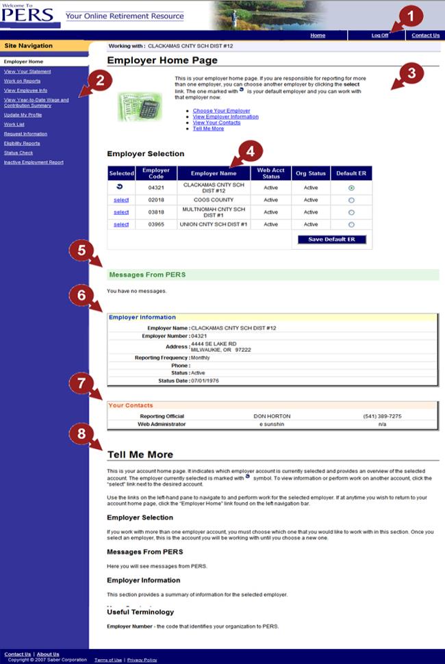 This page shows the employer or organization for which you are currently reporting and provides an overview of that employer's organization information and contacts.
