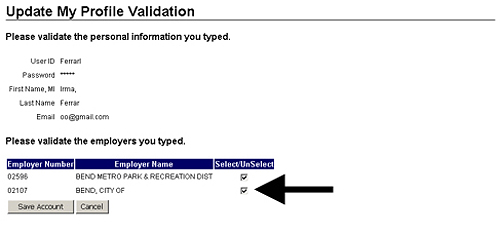 Remove a listed employer from your profile by clearing the Select/Unselect check box (indicated by the arrow) next to the employer. Note: Check marks in grayed-out check boxes cannot be cleared. Check boxes become grayed out once you save the account.