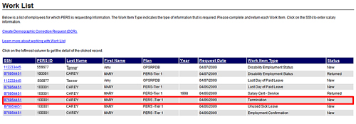 2 | Click on the SSN (highlighted by the box) of a member associated with “Termination” shown in the Work Item Type column. In the PERS Comments text box, PERS specifies information it needs from you before it can begin processing the employee’s benefit request. |
