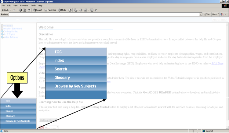 The option buttons allow you to choose the help file feature you want to use to locate information.